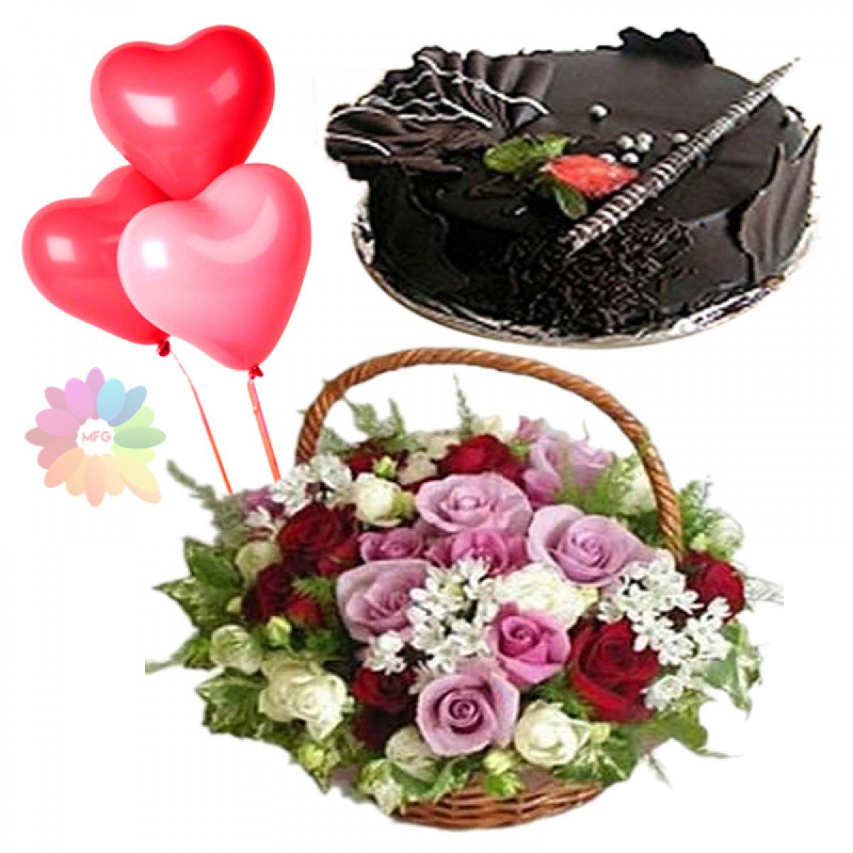Basket of 24 mix colour roses with 1 pound chocolate fantasy cake with 3 heart shape balloons