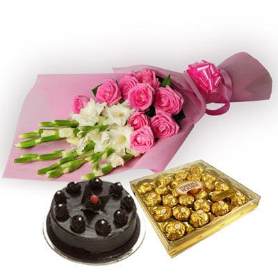 One Sided bunch of 5 white Glads, 12 Pink Roses in Pink color paper packing with pink ribbon bow, 1kg chocolate truffle cake and box of Ferrero Rocher.