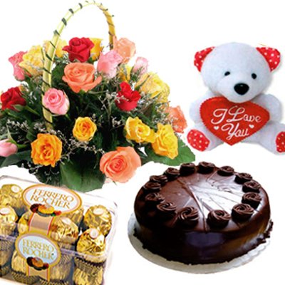 24 Multi Colour Roses Basket with 200 g ferrero Chocolates and 8 "Cuddly Bear. chocolates cake. i love you pillow Tell your friends / loved ones to gift you this