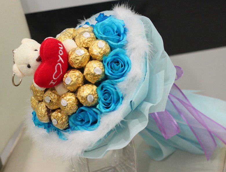 12 Blue rose with 16 Ferrero Rocher Chocolate & Heart Shape pillow and 9 inches teddy bear.