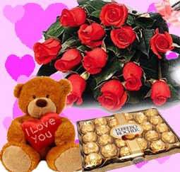 Bunch of 12 Red Roses and 9 Inches Teddy Bear m I love you pillow and 24 Ferrero rocher.