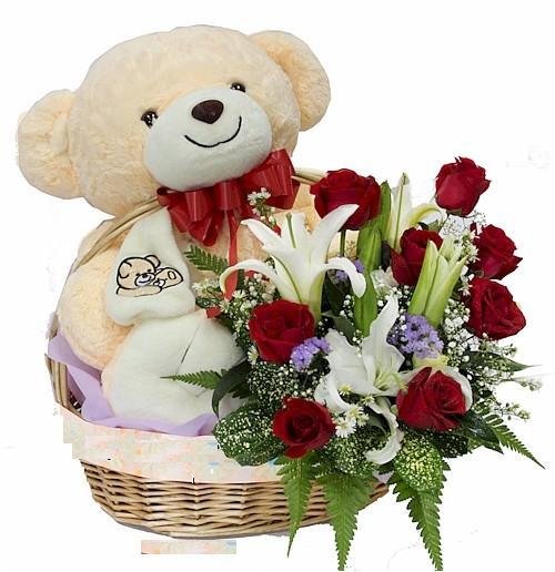 Surprise her with this big cuddly light brown bear (24") come with red rose & white lily arrangement in a basket. Sure to bring a smile to anyone who loves bears.