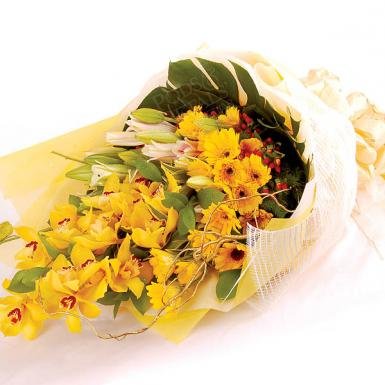 Shower her with a grand bouquet of Cymbidiums , Stargazer Lilies, Gerberas and Monstera.