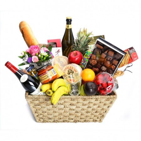 This is a very substantial basket as you can see. 8 items Fruits, cheese, belgian chocolates box red wine, libby's corn beef Tulip ham can mix flowers . This basket can be modified. In the comment/greeting section in checkout give us your request and we will adjust the basket to suite as best we can.