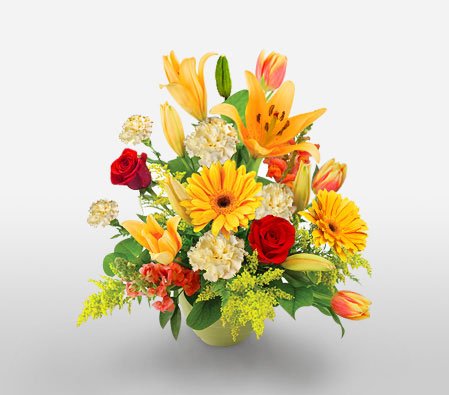Turn your loved ones home into a regal mansion with this exquisite combination of exotic snapdragons, carnations, lilies, roses, gerberas, tulips, solidago and leather leaf of oranges, reds, rusts and creams, neatly arranged in a fancy ceramic pot.