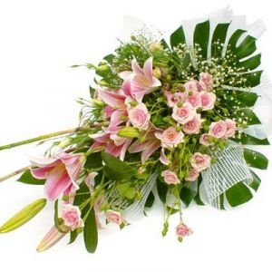 24 Pink Mix flowers beautiful hand bouquet, decorated beautifully with lots of green fillers and ribbon.