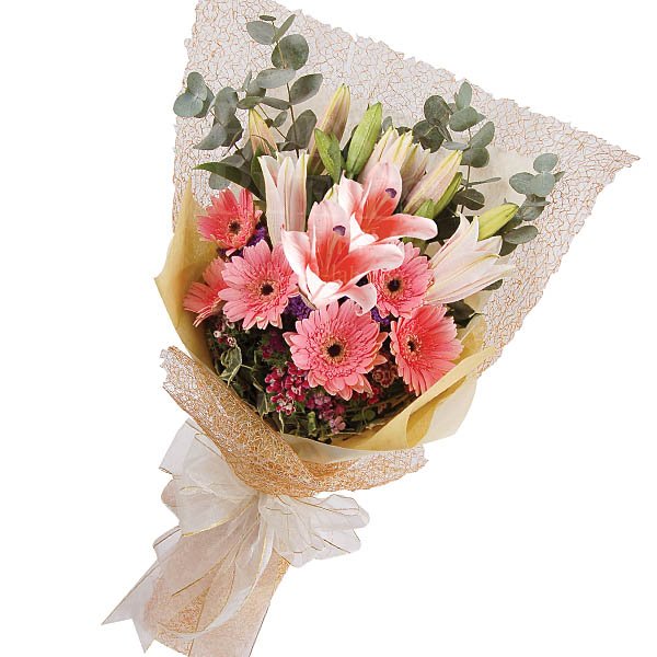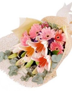 Fusion of Lilies, Holland Daisies and Eucaplytus to make her day. Picture shown is 3 Stalks of Stargazer Lilies and 6 Stalks of Gerberas / Holland Daisies.