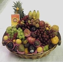 Our impressive large willow basket arrives filled with a selection of fresh seasonal fruit and cookies,biscuits,crakers & chocolate. The fruits may include pears, apples, grapes, oranges and bananas. Exact basket and fruit selection may vary by season and delivery location.(10 items).