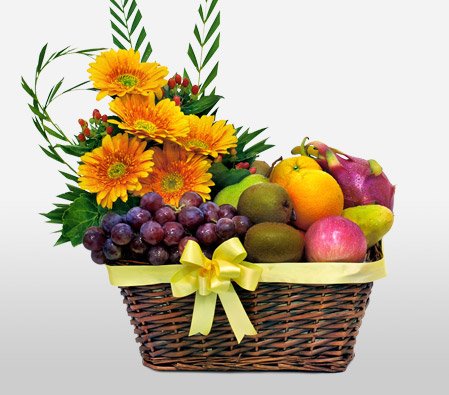 Description This mixed fruit basket is graced by an arrangement of gerbera and  Fruits Basket Arrangement. 8 items fruits