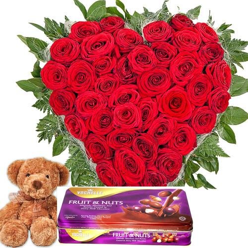 36 red roses in a heart basket with 8 inches teddy and a vochelle chocolate box