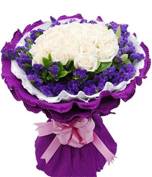 36 White roses, purple forget me rich periphery, lining a white or light-colored lines curling paper, round paper packaging for external use purple curling