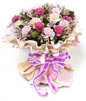 6 pink carnations, 6 purple carnations, 6 carnations with lily and green foliages