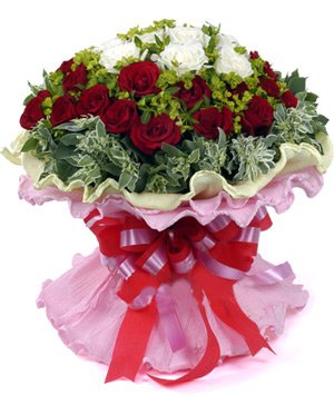 9 white roses in the middle, 24 red roses outside. with full euphorbia marginata outside. Yellow and pink curling round paper packaging, red and pink color bowknot. Imagine your recipient's surprise when this beautiful roses in assorted pastel colors arrive at their doorstep!