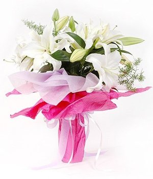 5 stalks white perfume lilies, with fillers decorate and tissue paper paper packed bouquet.