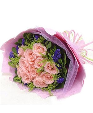 11 pink roses match solidago canadensis and dont-forget-me. Double layer pink crepe paper packing, pink ribbon the bottom.