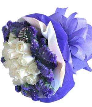 19 white roses (roses color can be changed to red, pink, champagne if you want), with purple forget-me-not.