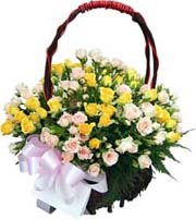 A super large yellow & white Basket consisting of 24 freshly cut Long Stemmed Roses & pink Ribbon.