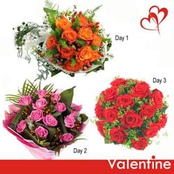 Day 1. Buch of 12 Orange Roses.( Dely on 12th Feb) Day 2. Bunch of 12 Pink Roses. ( Dely on 13 th Feb ) Day3. Bunch of 12 Red roses. (Dely on 14th Feb)